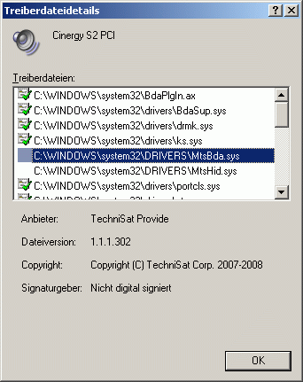 wade77 Posted February 19, 2009 Posted February 19, 2009 ich habe bei allen treibern das gleiche beobachtet. Aufgrund Deiner Tests habe ich die beiden Treiber 1.1.1.301 (Terratec) und 1.1.1.302 (Technisat) auch nochmals ausgetauscht und DiSEqC 1.1 getestet. Bei meinem DiSEqC 8/1 Schalter (EMP Centauri) gibt es definitiv einen Unterschied. Mit dem Terratec Treiber erreiche ich nur die LNBs 1...4, mit dem Treiber von Technisat alle 8 LNBs (erst uncommitted dann committed, andersrum geht bei mir nicht). Nochmals zur Klarstellung : ich habe den Treiber 1.1.1.301 (Terratec) wie üblich installiert und anschießend die MtsBDA.SYS im Windows Treiberverzeichnis durch die MtsBDA.SYS (V 1.1.1.302) vonTechnisat ersetzt. (PC Neustart nicht vergessen). Um sicher zu sein welcher Treiber verwendet wird schaue ich immer im Gerätemanager nach. 1. Treiber (zeigt installiertenTerratec Treiber) 2. Treiberdateidetails für die MtsBDA.SYS (zeigt Technisat Treiber) siehe beide GIFs. Seit ca. zwei Wochen betreibe ich die Terratec Cinergy S2 PCI HD Karte mit der DVBViewer beta damit problemlos (gilt auch für die DiSEqC 1.2 Variante, auch damit gehen alle 8 LNBs). Was mich betrifft können die DiSEqC 1.1 und 1.2 Funktionalitäten so in die nächste DVBViewer (GE) Version übernommen werden. Gruß wade77 , Quote