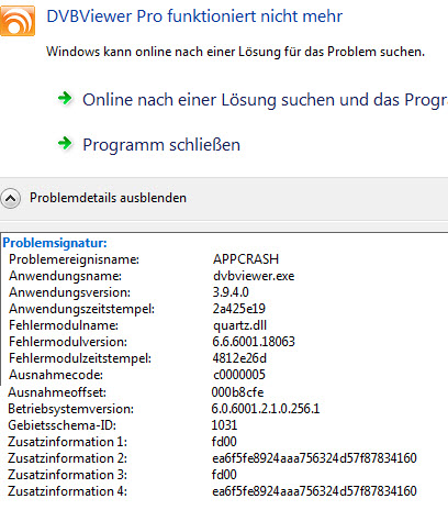 Bonkers Posted January 30, 2009 Posted January 30, 2009 (edited) Moinsen! Vorweg: Ich weiß, dass eigentlich nur die neueste version supportet wird, da ich aber mit der v4 noch mehr Probleme hatte als mit der 3.9.4 bin ich wieder auf letztere umgestiegen. Nun will diese aber leider auch nicht mehr und ich hoffe trotzdem auf Hilfe. Zum Problem. Wenn ich den DVBViewer normal starte kommt immer (ja wirklich immer) die tolle Vista Meldung "DVBViewer Pro funktioniert nicht mehr" (Prgramm schliessen). Das konnte ich bisher umgehen in dem ich den DVBViewer im Savemode gestartet und anschliessend per EPG DMAX eingeschaltet habe. Wähle ich als erstes einen anderen Sender aus kommt wieder besagte Meldung. Mit DMAX lief es (bisher) dann aber immer wieder. Jetzt klappt allerdings selbst dieses nicht mehr (ohne das ich irgendeine Änderung am System vorgenommen habe, nicht deinstalliert, nicht installiert, nichts umgestellt), und ich bekomme nur noch diese Fehlermeldung. Ich habe es bereits mit dem Kompatibilitätsmodus für WinXP SP2 probiert, und auch Aero und den ganzen Design schnick-schnack von Vista mal ausgemacht -> bringt nichts. So langsam treibt mich das ganze in Verzweiflung und deshalb habe ich mich entschlossen euch doch mal um Rat zu bitten, obwohl ich nicht die neuste Version verwende. Screenshot der Details der Fehlermeldung und support.zip siehe attachment. System: DVBViewer 3.9.4 OS: Vista Ultimate 64 bit MB: Gigabyte GA-X48-DS4 MB Chipstaz: Intel Bechwood X48 CPU: Intel C2D E8400 RAM: 8GB DDR2-800 GraKa: nVidia GeForce 9800 GTX+ (XFX) GraKa Treiber: 7.15.11.7813 (nicht die neusten, ich weiß) TV-Karte: WinTV-NOVA-S-Plus Treiberversion: ist mir leider nicht bekannt (ca. 3. Quartal 2008 neu geladen und installiert) Ich verwende im übrigen 2 Monitore falls dass von Interesse sein sollte. Der DVBViewer befindet sich auf dem zweitem Monitor. Und eben als ich diesen Satz geschrieben habe ist mir was eingefallen wo ich vorher einfach nicht drauf gekommen bin Starte ich den DVBViewer auf meinem ersten Monitor läuft alles Prima (hab nur den SafeMode probiert, da ich nur noch die Verknüpfung dafür habe. Werde aber auch gleich noch den normalen modus testen). Kann mit jedem beliebigen Sender starten. Zieh ich ihn wieder rüber auf den zweiten Monitor geht wieder nüscht Dolles Ding. Hätte ich auch vorher mal drauf kommen können das zu probieren. Ich nehme also an es ist eher ein Vista-Dual-Monitor-Problem als eines des DVBViewers, richtig? Ich stell die Anfrage trotzdem, vielleicht hat ja noch wer nen tipp... /edit* jaa, auch ohne safemode funktioniert es auf dem Primary-Monitor einwandfrei... gruß bonkers support.zip Edited January 30, 2009 by Bonkers Quote
