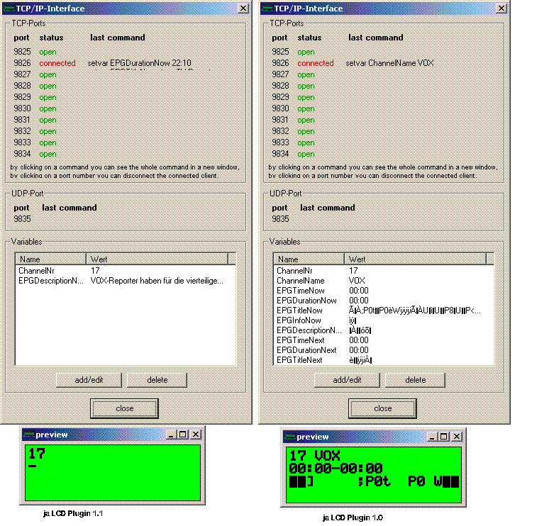 htro Posted September 13, 2005 Posted September 13, 2005 Im Membersbereich steht die angepasste Version vom jaLCD Plugin für den DVBViewer 3.2 und höher. lars <{POST_SNAPBACK}> [/quote Bei der Version 1.1 kommt bei mir statt Zeichensalat nur die Kanal-Nr. an. Benutze DVBViewer 3.2.1 auf Skystar 1 CI mit aktuellem Treiber und jaLCDs v3.2 Ich habe mal einen Screenshot vom TCP/IP-Interface angehängt. Links mit jalcdPlugin1.1, rechts mit jalcdPlugin1.0 (selbe config-Datei). Gruss - htro Quote