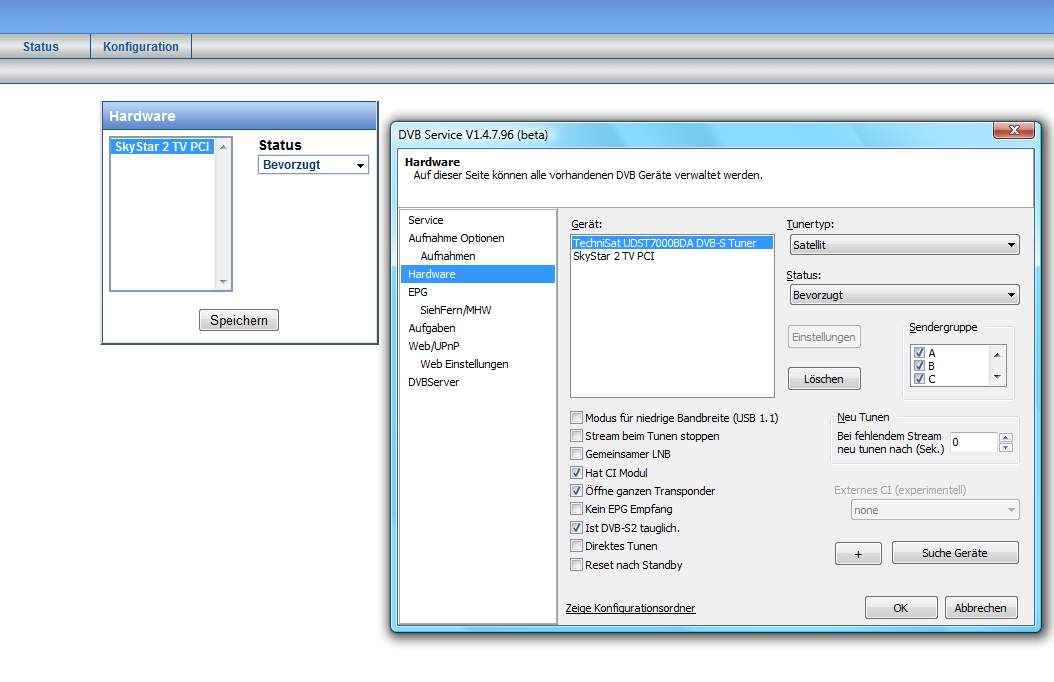 daflory Posted April 13, 2009 Author Posted April 13, 2009 Zumindest scheint die Karte nicht in der svrhardware.xml gespeichert worden zu sein. Wenn ein erneuter Hardware Suchlauf wo sicher alle anderen Programme außer dem Recordingservice Konfigurations Programm nicht laufen nicht hilft, lösche mal die svrhardware.xml (Konfigurationsverzeichnis > \config\svrhardware.xml) wenn DVBServer, DVBViewer, Recordingservice usw. sicher aus sind und starte dann nur den Recordingservice wird sie dann gefunden? Hallo nochmal, die Karte wird zwar erkannt, taucht aber nicht im Webinterface auf und kann auch nicht für Aufnahmen verwendet werden. Schau dir mal den Screenshot an, dann siehst du was ich meine. Die svrhardware.xml hab' ich gelöscht und einen erneuten Suchlauf gemacht. Ich habe auch eine neue support.zip angehängt. Der Server lag zwar noch im DVBV-Verzeichnis rum, war aber schon lange nicht mehr aktiv. Ich habe die DVBServer.exe jetzt gelöscht. Viele Grüße, daflory support.zip