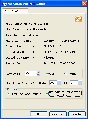 Griga Posted April 18, 2009 Posted April 18, 2009 Könnte auch ein Wiedergabeproblem sein. Setze mal probeweise ein Häkchen bei Ansicht -> Filter -> DVB Source -> Use DVB Clock (-> Übernehmen), dann Sender neu einstellen. Die DVBSource-Eigenschaftsseite ist ein wichtiges Diagnose-Hilfsmittel bei solchen Problemen. Werden dort Fehler oder Diskontinuitäten angezeigt, wenn es zu den Aussetzen kommt? Quote