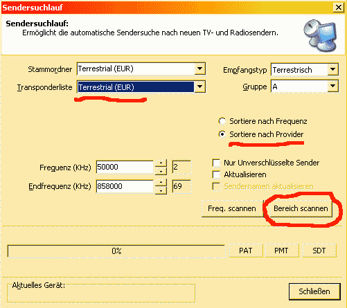 Technofriend Posted May 15, 2009 Posted May 15, 2009 (edited) Das sind meine Einstellungen für einen Suchlauf. Versuch es doch so nochmal. Also bei Transponderliste: "Terrestrial EUR", eine "Transponderliste DE" gibt es ja leider nicht. Die Antenne zum Suchen besonders gut plazieren, also am Fenster oder ausserhalb der Wohnung. Und dann zum Suchlauf starten auf "Bereich scannen" klicken, nicht auf "Frequenz scannen". Sonst scannt er nur diese eine Frequenz und da wird er dann nicht viel finden. Ist imho alles noch etwas missverständlich angeordnet, so dass man da schnell mal die falschen Einstellungen und Knöpfe nimmt. Edited May 15, 2009 by Technofriend Quote
