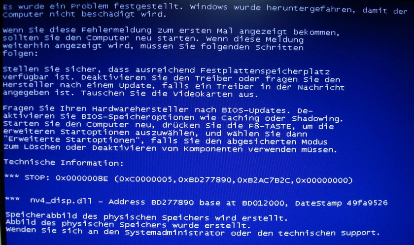 mp-tec Posted May 22, 2009 Author Posted May 22, 2009 (edited) Danke Tüftler für den Tip. Habe ich so gemacht und siehe da es funktioniert (Bluescreen). Ich habe mal ein Bild vom Screen gemacht da sieht man es besser, es sieht aus als ob mein Graka Treiber spinnt. aber ich weis beim bessten willen nicht was ich da machen soll. habe schon den neusten Treiber, habe es auch schon mit dem von Windows über das Update probiert, es will einfach nicht funktionieren. Was kann helfen oder wer kann mir helfen? Bluescreentext: STOP 0X0000008C (0XC0000005, 0XBD277890, 0XB2AC7B2C, 0X00000000) nv4_disp.dll - Adress BD277890 base at BD012000, Datastamp 49fa9526 Edited May 22, 2009 by mp-tec Quote