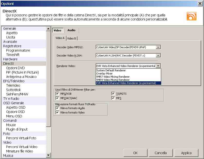 ardua97 Posted June 22, 2009 Author Posted June 22, 2009 as divx codec video decoder: Cyberlink Video/SP Decoder(PDVD9 UPnP) Decoder Video H.264:Cyberlink H.264/AVC Decoder (PDVD7.x) Render Video:EVR Vista EnHanced video render DVD Option Decoder Video MPEG2: video decoder: Cyberlink Video/SP Decoder(PDVD9 UPnP) Render Video:EVR Vista EnHanced video render Quote