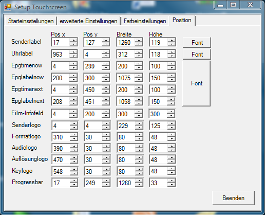 C-Men Posted April 18, 2010 Author Posted April 18, 2010 Hi, habe neue Version (touchscreen.1.1.0) online gestellt, hier zu finden -Hauptmonitor kann jetzt frei editiert werden(im Setup-Menü) Änderung sofort sichtbar(blauer Hintergrund); -Auflösung 800x600 und 1280x768als .ini hinterlegt; -Scrollbutton in Senderleiste ersetzt und erweitert mit Logo und Sendernummer; -Buttonleiste im Hauptmonitor ersetzt durch Extra-Menü; -timeshift-Anzeige überarbeitet -NotifyIcon und Menü in der Taskleiste entfernt Gruß Christian Quote