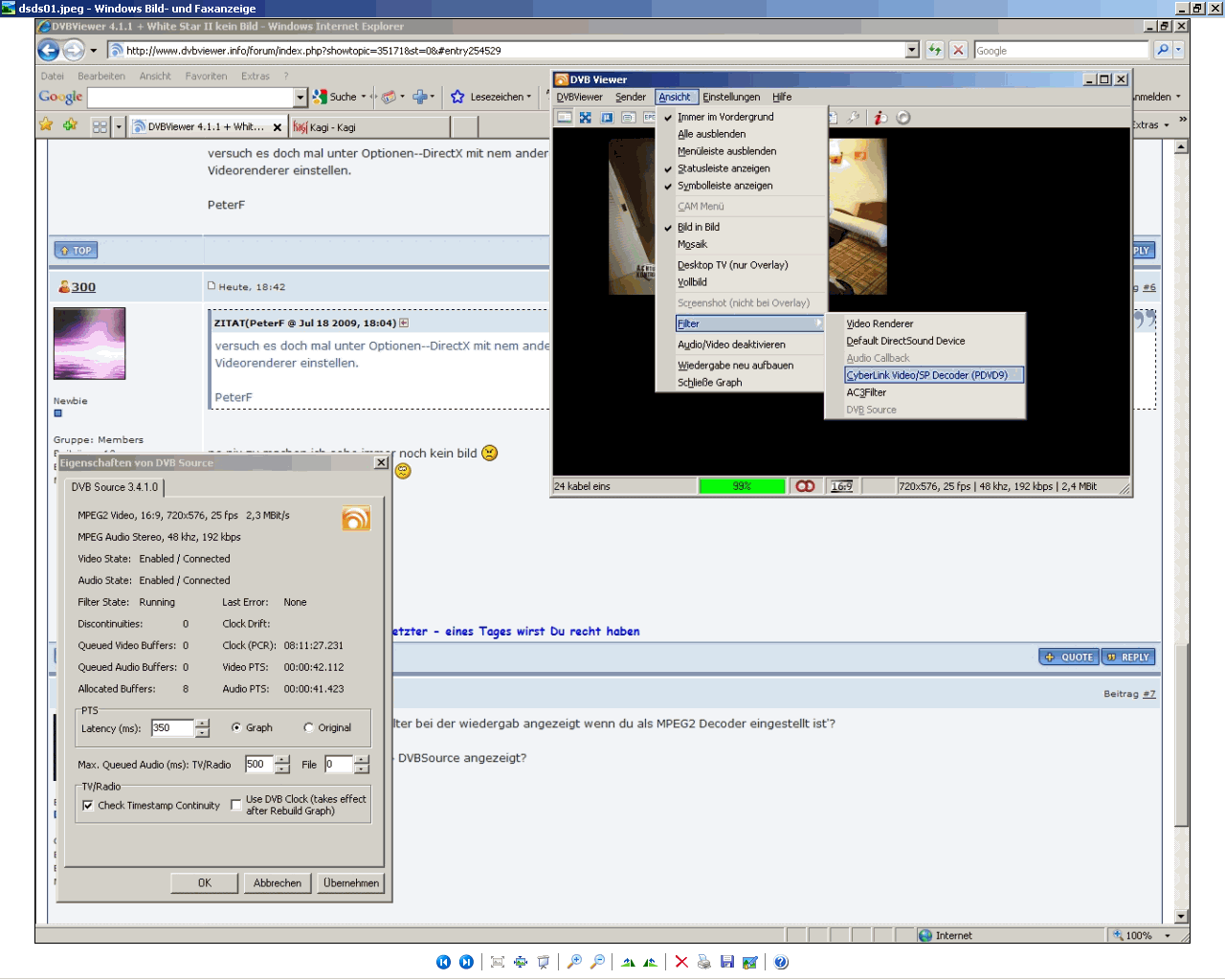 300 Posted July 18, 2009 Author Posted July 18, 2009 (edited) Wird Cyberlink unter Ansicht > Filter bei der wiedergab angezeigt wenn du als MPEG2 Decoder eingestellt ist'? Was wird unter Ansicht > Filter > DVBSource angezeigt? Hallo Tjod hab mal ein bild gemacht, weiss jetzt nicht genau was ich da alles rausschreiben soll. im hintergrund sieht man halt das bild in bild ist da, aber nur halt klein. Lg 300 Edited July 18, 2009 by 300 Quote