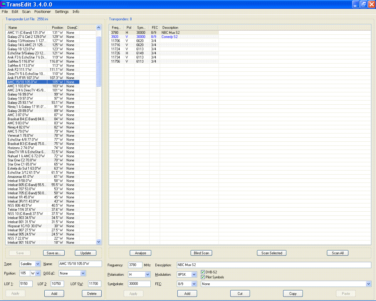 BigJohn500 Posted July 29, 2009 Author Posted July 29, 2009 No trouble here with a 1280 x 960 19" 4:3 CRC monitor. Please attach a screenshot. The "missing dll" is probably caused by a DirectShow filter (e.g. video or audio decoder). Try to select others on Settings -> Preview. I am not sure how you wanted the screenshot, so I hit 'Print Screen' button on upper right of keyboard, then pasted to 'Paint' program, and then saved as a .gif to save space. I am 57yo and have eyeglasses optimized for computer screen use, but the data in each box is still quite small and difficult to read. I wish there was a way to increase it's size as you can hit Ctrl + '+' to increase the size of web pages in FireFox. Also in the Screenshot, you will notice AMC 15/18 105.0°W, and transponder 3780H 30000 NBC Mux S2. I receive audio on this mux, but no video and some kind of exception popped up when starting DVBViewer. I think it is because when I performed an 'Analyze' on the Mux, it indicated H.264 video. And under the Settings -> Preview -> H.264 Video Decoder, there is not anything listed. Which H.264 decoder do you suggest to use with TransEdit/DVBViewer? Thanks much, John Quote