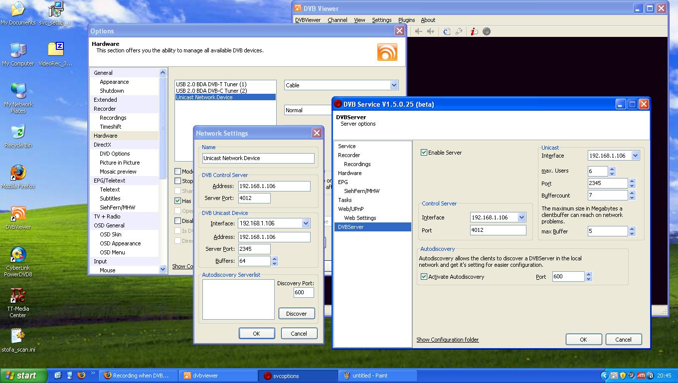 majstang Posted October 24, 2009 Posted October 24, 2009 I have the same problem! The DVBServer is not started, cuz if it was i would autodiscover the server without any problem. I have runned the old DVBServer without any problem before. Ports and adress is the same in client unicast and recording service config. The recording service is started before trying autodiscovery from client (rec service configuration is closed). I have followed every step in wiki up to the Autodiscovery point and it does not work for me. Have Windows XP. How can i confirm that the DVBServer is started? Is the server integrated in DVBVservice.exe....i cant find it anywhere (Device Manager or Windows Local Service). Well, DVBVservice.exe is there alright but no sign of the server.