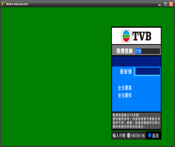 Gary Lam Posted August 20, 2009 Posted August 20, 2009 The Mheg transmissions in Hongkong also seem to work - at least partially. There is a unicode display problem which needs to become fixed, as well as some weird behaviours caused by Invalid actions fired by the Mheg Application. Either its a bug in our interpreter, or a problem caused by the provider. Christian I had sent you another TS contains new MHP functions. Please test. Thanks Quote