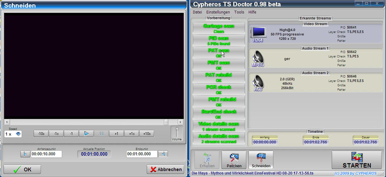 Derrick Posted August 20, 2009 Posted August 20, 2009 ..den tsdoctor habe ich ja schon ein paar mal erwähnt. Der begriff schneiden erweckt wahrscheinlich zu hohe erwartungen. Besser wäre imho trimmen, denn zum rauschneiden von werbung eignet er sich nicht. Mit dem tsplayer geht das trimmen i.d.r. viel schneller aber mit dem tsdoctor lassen sich anfang und ende viel genauer (mit bild) bestimmen. Seit die BBC ac3 wieder richtig kennzeichnet, sind die reparaturfähigkeiten allerdings kaum noch nötig Quote