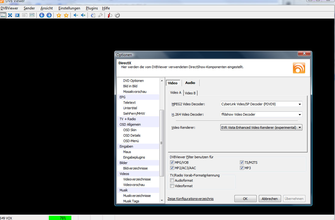 jabberwokky Posted August 29, 2009 Posted August 29, 2009 Hallo Team! Tut mir leid, dass ich zuerst eine E-Mail geschrieben habe, aber ich wusste nicht, dass der Support ausschließlich über das Forum läuft. Ich hab folgendes Problem: - Ich hab kein Bild mehr beim TV-Schauen (weder mpeg2 noch h.264) - Ich hab keinen Ton mehr Das EPG wird ganz normal geladen, aber ich seh halt nur schwarz und alles bleibt stumm. DVDs werden allerdings korrekt abgespielt, genauso wie Matroska Container mit h.264 Inhalten. Wie ist das ganze entstanden? Ich konnte keine HD-Kanäle mehr schauen, da der h.264 Decoder von PowerDVD nicht mehr als Decoder angezeigt wurde. Darum habe ich mir den Divx h.264 Decoder runtergeladen und installiert. Danach war alles dunkel OK...Divx nochmal deinstalliert. Leider immer noch alles dunkel. PowerDVD deinstalliert und mit GSpot hab ich geschaut, ob irgendwelche Codecs Probleme bereiten. Scheinbar alles in Ordnung. Danach hab ich PowerDVD neu installiert. Kein Bild, kein Ton. Danach nochmal Divx probiert. Kein Bild, kein Ton. Und danach hab ichs noch mit FFDShow probiert. Kein Bild, kein Ton. Unter DirectX kann ich die unterschiedlichen Decoder für Bild und Ton wählen, aber es funktioniert halt keiner (siehe Screenshot). Vielen Dank schon mal im Vorraus Sebastian support.zip Quote