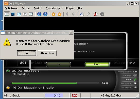dvb-michi Posted November 4, 2009 Posted November 4, 2009 Ich denke ich habe jetzt die Ursache gefunden: Eine Einstellung im DVB Task Scheduler. Man muss dazu die scheduler.exe im Programmverzeichnis mit Doppelklick starten. In den "Settings" war der Haken drin bei "Restart DVBViewer without Tuning last Channel". Seit dem der bei mir raus ist geht's wieder, auch die Warnungen in der Ereignisanzeige sind weg. Der Sender wird jetzt auch wieder eingestellt, dafür ist ja das Häkchen. Ton geht sofort, Bild kommt erst nach "Wiedergabe neu aufbauen". OT: Die Beta zu installieren brachte, was das angeht, nichts. Aber immerhin geht jetzt die EPG-Info wieder direkt, ohne hin und her zu klicken. Dafür klappt was beim Dateinamen einer Aufnahme nicht mehr. Das, was ich als "Beschreibung" in der Aufnahmeprogrammierung eingebe, wird nicht angehängt. Es bleibt nur Datum/Uhrzeit/Sender und der Titel aus dem EPG. Dateiname bei Aufnahmen ist "%date_%time_%station_%event_%title". Den Task Scheduler 2.0 habe ich nicht probiert, aber durch deinen Tip bin ich wenigstens darauf gekommen, mal dort in die Einstellungen reinzusehen. Quote