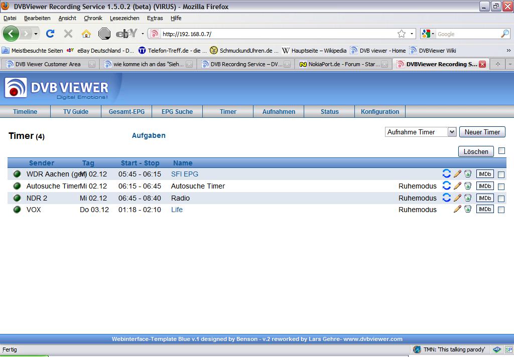Tjod Posted January 5, 2010 Posted January 5, 2010 Da hab ich mal eine Verständnisfrage - woher weiss ich, dass SFI Daten (=SiehFern Daten, denke ich) vorhanden sind? In dem du bei Sendern EPG hast/mehr EPG hast als du vorher hattest z.B. bei Eurosport. Nimmst Du den gesamten Transponder bei dem EPG-Timer? Wenn du die DVBViewer Pro Beta verwendest, nimm den Reckording Service 1.5.0.60 Beta test. Da kannst du das "Siehfern info" Update einfach in den Optionen aktivieren (EPG > Siehfern info Update). Was ist eine AutoSuche-Timer hinterher? http://www.DVBViewer.info/forum/index.php?...mp;hl=AutoSuche http://de.DVBViewer.tv/wiki/Timer_Konzept_...utosearch_timer Quote