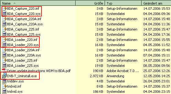 Geordie LaForge Posted September 11, 2006 Posted September 11, 2006 Hallo Leute! Wie schon an anderer Stelle erwähnt bringt man den DVB-T Stick von Club3D (ZAP-TV250mini) unter WindowsXP folgendermaßen zum laufen: Deinstallieren ALLER WDM und eventueller BDA-Treiber per uninstall der Original-Software, vorher den Stick abziehen. Man besorge sich die Treiber von der Freecom-Webseite für den DVB-T Stick für Windows XP, Version 8584 Was sich im Verzeichnis entpackt und was man braucht ist hier zu sehen: Die nicht rot markierten Dateien können bedenkenlos gelöscht werden Ich habe sicherheitshalber den Uninstaller einmal aufgerufen, nach dem ersten Start und Ende kommt er ein zweites mal, nicht wundern. Mit einem Texteditor macht man folgendes: Zuweisungen ändern in BDA_Capture_220.inf: in Abteilung [VID] %DevModel.DeviceDesc%=DevModel.Dev,USB\VID_14AA&PID_0221 und in Abteilung [strings]: DevModel.DeviceDesc="Club3D ZAP-TV250mini" DevModel.NAME="Club3D ZAP-TV250 Receiver" Zuweisungen ändern in BDA_Loader_220.inf: in Abteilung [strings]: WT220Uer.DeviceDesc="Club3D ZAP-TV250mini" Die folgende Vorgehensweise entspricht der normalen manuellen Prozedur bei Windows XP zur Treiberinstallation: Den Stick einstöpseln und die Installationsaufforderung zu 'USB-Device' abwarten. Dann eine manuelle Treiberinstallation vornehmen (also Windows nichts automatisch machen lassen!) Der erste Teil der Installation weist auf ein Club3D ZAP-TV250 hin. Nachdem der Treiber installiert wurde erscheint automatisch die Aufforderung zum Capture-Treiber. Auch hier alles selbst machen und das o.a. Verzeichnis als Datenträger angeben. Die Meckerungen, dass der Treiber nicht signiert ist und dass der Treiber evtl. nicht funktioniert, ignorieren. Das wars auch schon. Der Transedit sollte nun den Stick als 'Club3D ZAP-TV250 Receiver' gefunden haben und ein Scan erfolgreich laufen (sofern die Empfangsverhältnisse stimmen :-)) Getestet an 3 Windows XP-Rechnern unterschiedlicher Ausprägung, unter Windos2000 gings erwartungsgemäss nicht. Möglich dass es auch mit anderen Treibern geht, aber nur mit der o.a. Vorgehensweise habe ich Erfolg gehabt. (OT: Ich habe noch eine Terratec Cinergy T2 im Einsatz, die hat aber schlechtere Empfangsqualitäten)