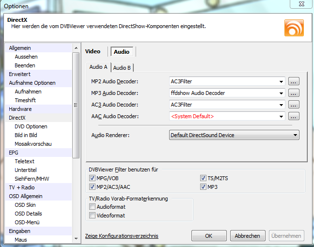 rastik Posted December 22, 2009 Author Posted December 22, 2009 (edited) Ja das weiss ich ja nicht ob der Rec.Service etwas daran ändern kann!Wenn er es nicht sein kann, ok. Mich würde ja auch nur interessieren was da vorsich geht, denn das passiert nie wenn ich den DVBV ohne einen angeschlossenen Client in den Standby setze!Dann geht ja auch der HTPC im Wohnzimmer aus!Meine Vermutung lag halt nur am Rec.Service da ja der den Standby verhindert damit der 2te Client noch den Server erreicht, und nur halt dann passiert das ganze! MFG Rasti Ach ja meine DirectX Audio Konfig. sieht so aus Edited December 22, 2009 by rastik