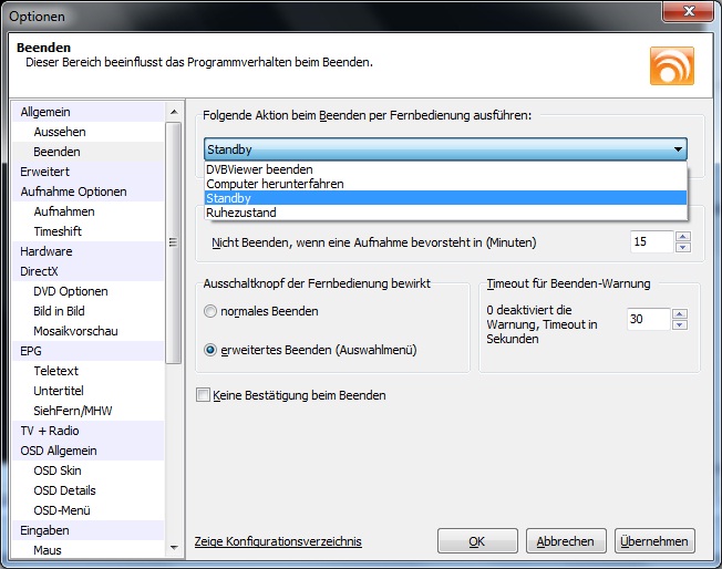 Eichhorn Posted February 23, 2010 Posted February 23, 2010 Mein BS istWindows7 32. In den Energieoptionen ist "Hybriden Standymodus zulassen auf AUS". Wenn ich nun den Rechner über den DVBViewer (OSD Menü) ins Standby fahren will, schreibt er noch eine Ewigkeit was auf HDD, genau wie beim Ruhemodus. Wenn ich ihn dann wieder an mache, meldet sich auch zuerst das Bios, wie beim Ruhemodus. Wenn ich jetzt allerdings den DVBViewer schließe und den Rechner über das Startmenü ins Standby (Energie sparen) fahre, ist er sofort aus und bei einem erneuten Einschalten auch sofort an. (ohne Biosmeldung) also wie es sein sollte. Wie bekomme ich das auch so über das OSD des DVBViewer hin? Quote