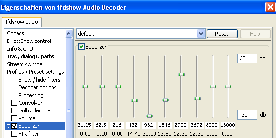 Griga Posted June 13, 2010 Posted June 13, 2010 Hier zusammengefasst die Schritte, um den DC DSP Audioprozessor im DVBViewer einzubinden: 1) Postprocessor Plugin installieren (Mitgliederbereich -> Plugins, ReadMe beachten!): http://www.DVBViewer.info/forum/topic/17518-postprozessor-plugin/page__view__findpost__p__196409 2) DC DSP Filter installieren http://www.free-codecs.com/download/DC_DSP_Filter.htm 3) Eventuell Microsoft Visual C++ 2008 SP1 Redistributable Package installieren, falls die MSVCR90.DLL im System fehlt: http://www.microsoft.com/downloads/details.aspx?displaylang=de&FamilyID=a5c84275-3b97-4ab7-a40d-3802b2af5fc2 4) DVBViewer starten, im Plugins-Menü -> Audio-Postprocessor -> DC DSP Filter anwählen. 5) Eigenschaftsseite des DC DSP Filters über Ansicht -> Filter öffnen. Rechtsklick auf die Filter and Effects-Liste -> Add DSP, die gewünschten Filter hinzufügen und experimentieren. Am besten funktioniert es bei mir bislang so: http://www.DVBViewer.info/forum/topic/41076-audiofilter-anwenden/page__view__findpost__p__301320 Quote