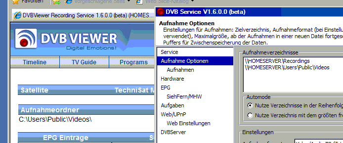 mague Posted June 14, 2010 Posted June 14, 2010 Hi, ich hatte/habe massive Probleme mit arte, EinsPlus usw. Ich habe da einiges rumprobiert. Unter Anderem unterschiedliche DVB-S Hardware ausprobiert und auch ein Versuch mit der vorletzten 1.5.x Version von RS. Irgendwie kann ploetzlich keine meiner DVB-S Karten arte, EinsPlus usw. finden. Nur die Technisat Skystar HD2 und der STB Receiver. Koennte am mainboard liegen, meine KNC hat nun monatelang auf einem anderen board funktioniert. Egal, solange die Technisat es tut... Letztendlich habe ich alles, DVBV und RS deinstalliert und DVBV 4.2.1 und RS 1.6.0.0 neu installiert. Ich habe beim deinstallieren Programm- und Konfigurationsorder loeschen lassen. Ich habe RS auch schon einzeln deinstalliert, und den config Ordner von Hand geloescht. Problem: Der Recording Service hat Probleme mit den Pfaden fuer die Aufnahme. Obwohl eigentlich keine Konfiguration mehr vorhanden sein duerfte, schlaegt schon der Installer die alten UNC Pfade vor. Die stehen auch in config\service.xml. Trotzdem zeigt die Statusanzeige des Webinterface diese nicht an, sondern den Standartpfad C:\Users\Public\Videos\ . Dorthin nimmt der RS auch auf. Wenn ich den Service stoppe und die Konfiguration aufrufe, dann stehen dort zwei UNC Pfrade drin. Ich kann diese loeschen und neu anlegen, aber das andert nichts. Webinterface zeigt weiter den C:\\ Pfad an und nimmt dorthin auch auf. Was tun ? support.zip