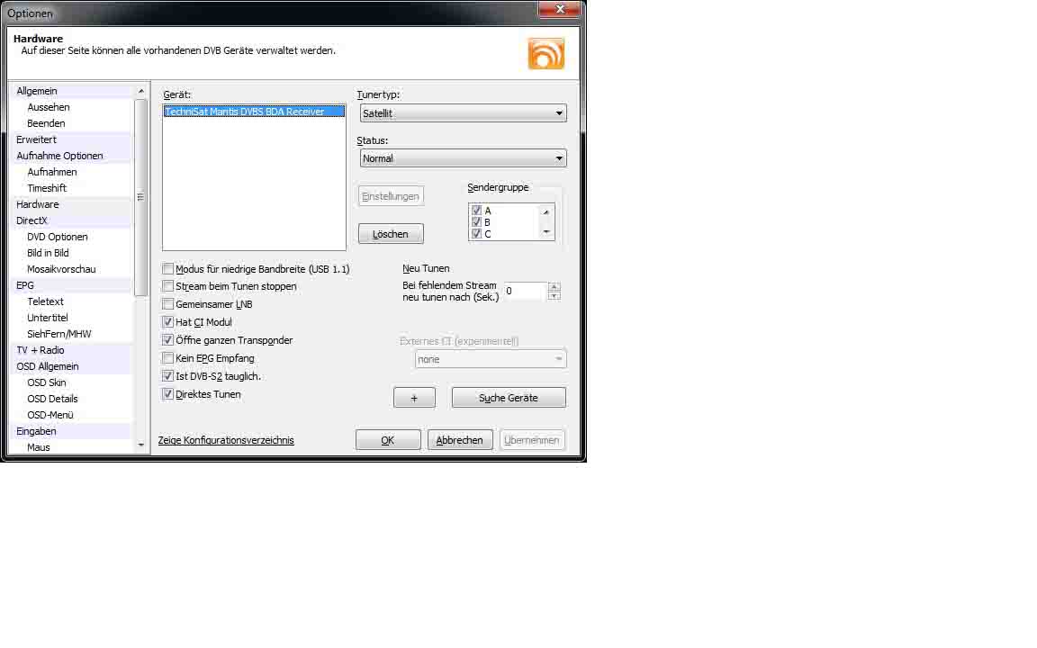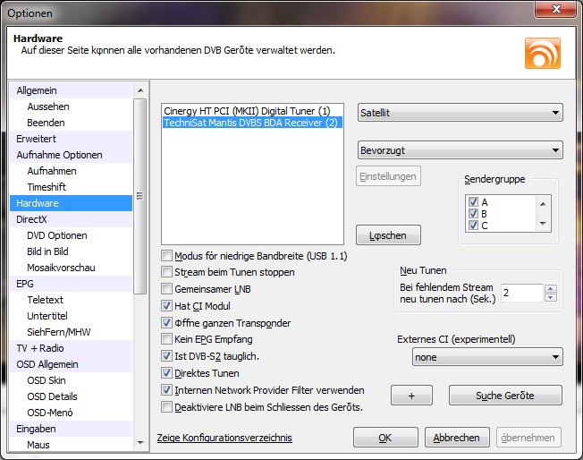 strs65 Posted June 25, 2010 Posted June 25, 2010 Go to "Einstellungen" > "Optionen" > "Hardware" and check the "Ist DVB-S2 tauglich" box. Quote