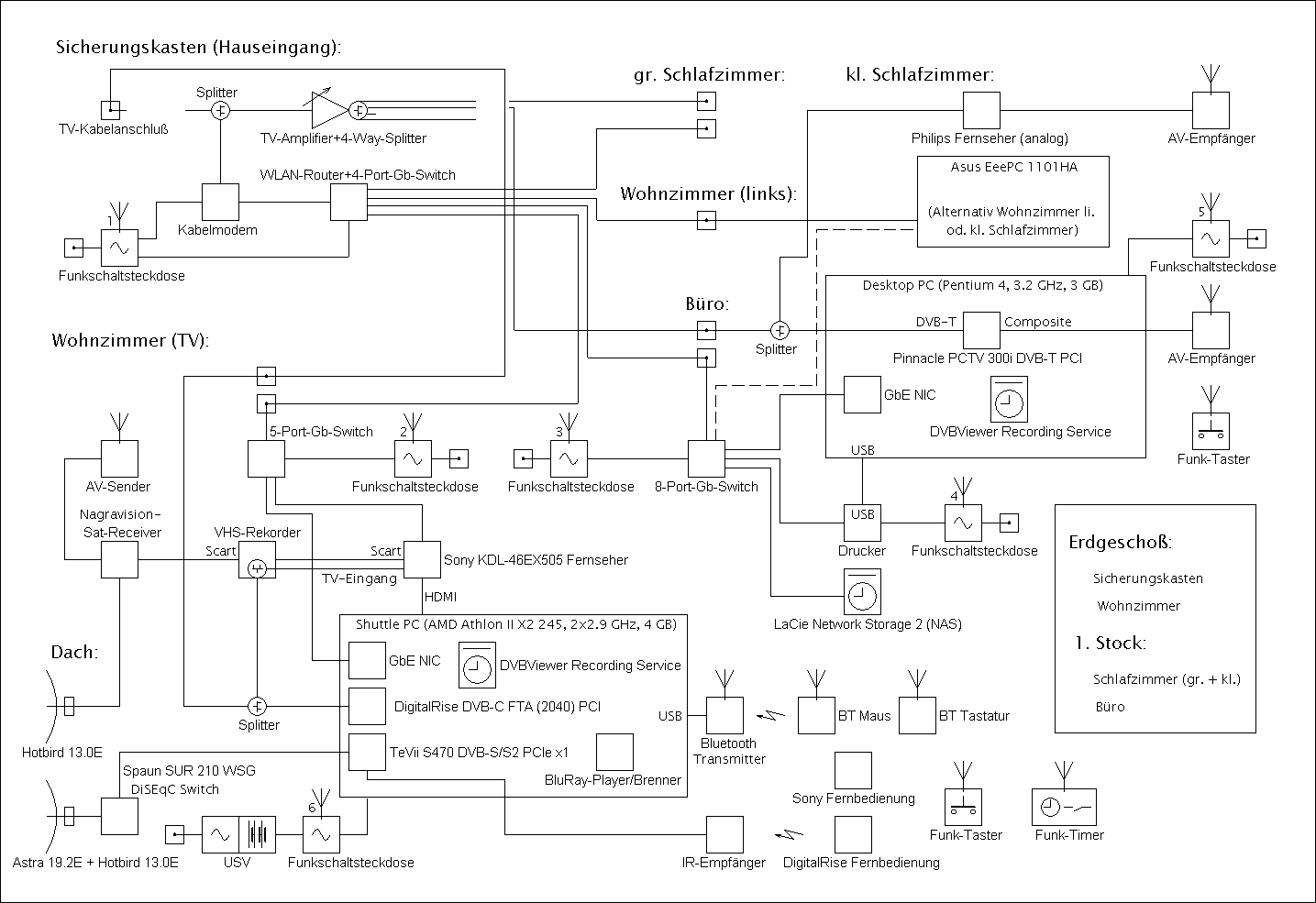 ostbey Posted August 2, 2010 Author Posted August 2, 2010 (edited) Bei mir läuft es seit 12 Tagen auch stabil; und zwar mit Antennenverstärker, dessen Regler aber auf Minimum eingestellt ist. Offenbar ist das besser als die direkte Verbindung ohne Verstärkung, die ich während meiner Abwesenheit Mitte Juli eingestellt hatte (und die teilweise zu Tausenden von Fehlern im Log sowie zu gänzlich fehlgeschlagenen Aufnahmen geführt hatte), denn zwischen Anschluß im Sicherungskasten und Fernseher bzw. HTPC liegen nochmal ca. 18 Meter Kabel (in der Decke/Wand und von der Anschlußdose im Wohnzimmer zum Gerät). Wieviel Signaldämpfung können denn 18 Meter Kabel und die mehreren Steckverbindungen (sowie ein Splitter) in etwa verursachen? Siehe dazu auch den folgenen Schaltplan (mit der Konfiguration, die seit 12 Tagen problemlos funktioniert). EDIT: Im hier angehängten Schaltplan die Variante OHNE Antennenverstärker (d.h. die Konfiguration, die die großen Probleme gemacht hat). Edited August 2, 2010 by ostbey Quote