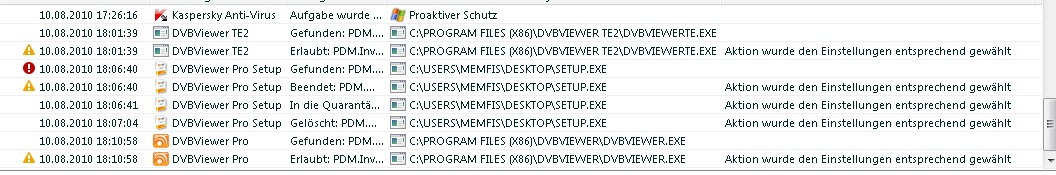 DasFragezeichen Posted August 10, 2010 Posted August 10, 2010 (edited) Was Kaspersky in letzter Zeit an Fehlmeldungen raushaut ist echt unverschämt. Den DVBViewer hat es jetzt auch erwischt. Was ich so gegoogelt habe wohl nicht zum ersten mal, dass der DVBViewer auf der schwarzen Liste steht. Sowhl meine Version auf Festplatte, als auch die neu heruntergeladene von gerade eben wurden eiskalt in die Quarantäne verschoben. Edit: Verdammt, warum kann ich hier kein jpg anhängen!? Edited August 10, 2010 by DasFragezeichen Quote