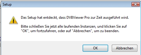 thsim Posted September 19, 2010 Posted September 19, 2010 Hallo Beim starten des Setup Prozesses erscheint die Meldung "Das Setup hat entdeckt das DVBViewer Pro zur Zeit ausgeführt wird" Diesselbe Meldung auf zwei Rechnern, DVBVieweer läuft nicht, Recording Service wurde aus dem Autostart genommen und neu gestartet. Im Task MAnager deutet nichts auf eine laufende DVBViewer Session hin. ?? Was ist zu tun?? mfg Quote