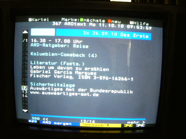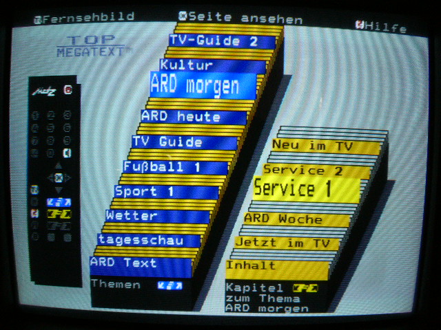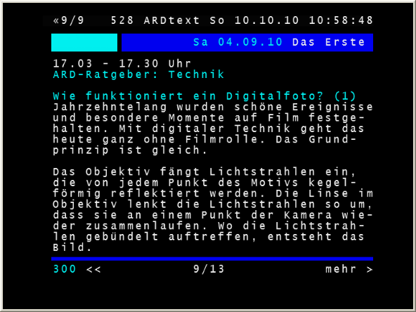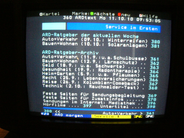 Derrick Posted October 8, 2010 Posted October 8, 2010 ..automatisches weiterblättern in den unterseiten kann man anhalten, umgekehrt geht ja aber nicht Ich dachte, dass eingangs eine anzeige gewünscht wurde, welche der unterseiten bereits gespeichert sind (>..wenn im Videotext-Fenster... ..eine Zeile mit einer Auflistung der vorhandenen Unterseiten der angezeigten Videotext-Seite angezeigt würde.). Hier ein beispiel eines tv-dekoders. Unten sieht man in der reihe der unterseiten in schwarz die bereits gespeicherten und in grau die noch nicht gespeicherten unterseiten. Quote