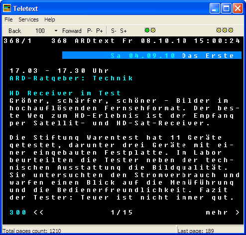 Webturtle Posted October 8, 2010 Author Posted October 8, 2010 Hallo Derrick, an ein automatisches Weiterblättern wie beim Fernsehgerät habe ich eigentlich gar nicht gedacht. Wenn man die Unterseiten lesen oder mit DVBViewer GE komplett speichern will, sollten sie zu diesem Zeitpunkt vollständig geladen sein, damit nichts fehlt oder man beim Durchblättern nicht dauern auf den Nachbarseiten landet. Bei ProgDVB bis Version 4.x gab es einen brauchbaren Videotext-Dekoder, der ähnlich wie bei DVBViewer GE auf Wunsch alle eingehenden Videotextseiten auf der Festplatte gespeichert hat. Für jede schon vorhandene Unterseite wurde am oberen Rand ein Punkt angezeigt (Die vorhandenen Seiten gelb, die gerade angezeigte grün). Als Beispiel habe ich unten einen Screenshot beigefügt: Viele Grüße Webturtle Quote