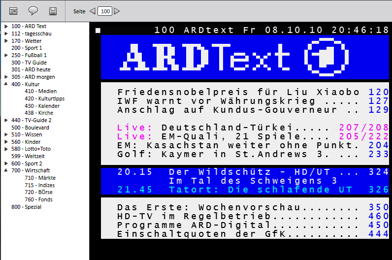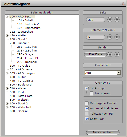 Webturtle Posted October 11, 2010 Author Posted October 11, 2010 Hallo Giga, wahrscheinlich habe ich mich mißverständlich ausgedrückt. Es ist gar nicht nötig, daß der Videotext-Dekoder gleich von Anfang an anzeigt, wieviel Unterseiten es insgesamt gibt. Es reicht ja schon, wenn er die bisher empfangenen anzeigt. Unser TV-Gerät hat z.B. an linken Rand der Videotext-Seiten eine Zahlenspalte zu Auswahl der angezeigten Unterseite, in der die schon vorhandenen Unterseiten weiß hervorgehoben sind und mit der Auf- bzw. Abwärtstaste angewählt werden können. Bei ProgDVB wird auch nur für jede angekommene Unterseiten an der richtigen Stelle ein gelber Punkt angezeigt. Z.B. bei der Unterseite 5 an der fünften Position in der betreffenden Zeile. Zum Pinnacle Videotext: Wie kommen die auf die seiten titel und die hierachie? Bei Pinnacle (nachdem Pinnacle die TV-Hard- und Software-Sparte an Hauppauge verkauft hat jetzt PCTV) werden im Teletext-Navigationsfenster laut Handbuch die TOP-Text Seiten angezeigt. Falls kein TOP-Text vefügbar ist, wird eine Auswahl möglicher Teletext-Seiten angegegen. Die Bezeichnung der Seiten im PCTV Teletext-Navigationsfenster stimmt mit denen beim Mega-(TOP-)Text des TV-Gerätes überein. Der stammt aus dem aktuellen PCTV TVCenter von hauppauge/pinnacle. Funktioniert auch nur mit deren karten und man muss eine entsprechende serien nummer von der install CD haben. Und es ist ein 560 MB download Übigens was die Größe der Download-Datei bei PCTV anbetrifft: Bei Pinnacle war es eine Setup-Datei von ca. 150 MB. Bei Hauppauge ist das Update ähnlich groß. Nach der Übernahme von PCTV waren sie laut Hotline noch nicht so weit ein ähnlich kompktes Update anzubieten. Da haben sie wohl einfach ein Image der jeweiligen Installations-CD zu Download ins Netz gestellt. Videotext beim TV-Gerät (Metz): Videotext bei Pinnacle (PCTV): Webturtle Quote