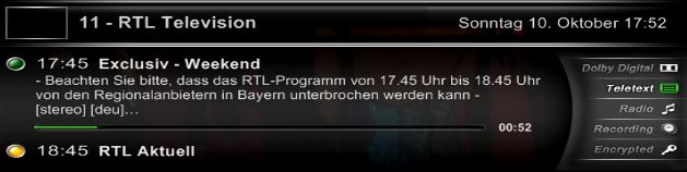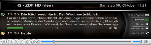 Tjod Posted October 9, 2010 Posted October 9, 2010 Das ist so im OSD Skin vorgesehen. In der Version 4.2.1 gab es einen Bug der dazu geführt hat dass das nicht angezeigt wird, auch wenn das im OSD Skin aktiviert wurde. Du kannst das aber mit eine OSD Skin Editor einfach ausblenden. Skin auswählen > MiniEPG auswählen > Fortschrittsbalken auswählen > Label > Aktiv/Sichbarket > False > Speichern. http://www.DVBViewer.tv/forum/topic/40078-dvbviewerskinner-ein-osd-skin-editor/ http://www.DVBViewer.tv/forum/topic/23804-osd-skineditor/ Quote