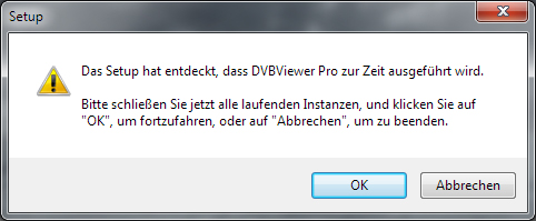 dovf Posted October 12, 2010 Posted October 12, 2010 (edited) Hallo, wollte soeben die Version 4.5 installieren, leider streikt das Setup gleich zu Begin mit angehängter Fehlermeldung. Hab extra neu gestartet und auch den Autostart des Recording Services deaktiviert, kann auch sonst keinen DVBViewer Task erkennen. Woran scheitert die Installation? System: Windows7 Professional Biser ist die DVBViewer Version 4.2 drauf Danke! //edit: als ich das Setup erstmalig ausführte, war der DVBViewer eingeschaltet... Vielleicht "merkt" sich das die Installation irgendwie? Edited October 12, 2010 by dovf Quote