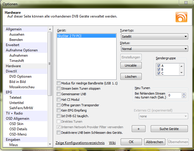 Kaasie Posted November 14, 2010 Posted November 14, 2010 Hallo, habe das selbe Problem und hatte es auch schon hier geschrieben....(Hallo, habe folgendes Problem. Nach Start des Viewer's erhalte ich manchmal die Meldung "Für diesen Sender ist kein DVB- Gerät verfügbar". Bei der Technisat Edition geht alles prima, wenn ich diese starte. Wenn ich den Rechner neu gestartet habe funktioniert der Viewer ohne das ich irgendwas geändert habe gelegentlich ohne Probleme. Mein System ist Win7 64bit mit einer Skystar2. Unter Optionen-Hardware steht die Karte drinnen, wird also erkannt. Hat jemand ähnliche Probleme oder weiß Rat? Wie gesagt, ab und an geht alles problemlos und dann kommt mal wieder der Fehler... Vielen Dank für Eure Hilfe und Rat!!! Hatte da auch 2 Bilder hoch geladen. Nur leider keine Antwort. Die hier genannten Lösungsvorschläge helfen bei mir leider nicht. Das Gerät steht unter Hardware drin und es kommt trotzdem die Meldung das kein Gerät verfügbar ist. Lustig ist, dass nach mehreren Neustarts des Rechners dann der Viewer manchmal problemlos ohne irgend eine Veränderung läuft. Die älteren Versionen liefen ohne Probleme. Weiß jemand Rat? Hab wahrscheinlich den Fehler gefunden. Lag an dem Programm Recording service. Hab es deinstalliert und jetzt funktioniert der Viewer. Hatte ich da was falsch gemacht? Quote