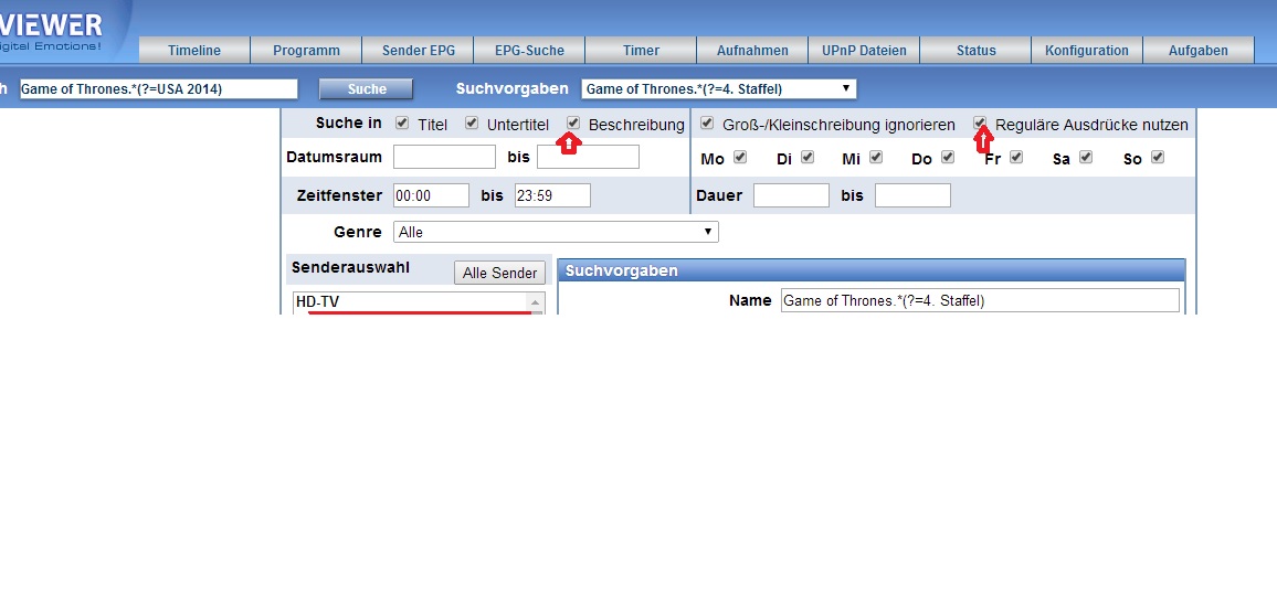 mklingbeil Posted June 2, 2014 Posted June 2, 2014 Es geht beides siehe Anhang. Game of Thrones.*(?=4. Staffel) und auch Game of Thrones.*(?=USA 2014) Ich habe mal die wichtigen Häkchen markiert das wären Suchen in Titel, Untertitel und Beschreibung. Und in Reguläre Ausdrücke nutzen.