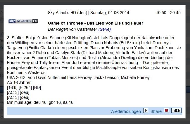 mklingbeil Posted June 1, 2014 Posted June 1, 2014 Das sollte dann nur die 4. Staffel aufnehmen. Game of Thrones.*(?=4. Staffel) Das kannst du ja mal mit der 3. Staffel testen aber achte darauf das Reguläre Ausdrücke nutzen aktiviert ist. Man könnte es auch über das Zeitfenster einschränken.