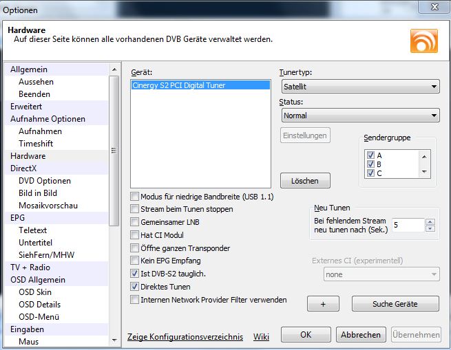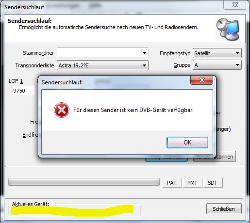 Onestone70 Posted November 30, 2010 Posted November 30, 2010 Hallo Zusammen, ich habe DVBViewer mit einer Terratec Cinergy S2 HD PCI Karte installiert und komme nicht weiter. Die Hardware wird einwandfrei gefunden (Bild 1), jedoch kann ich keinen Sendersuchlauf machen (Bild 2). Weder im DVBViewer noch im Transedit kann die Karte dann angesprochen werden. Ich habe sonst keine Software laufen und habe auch schon hier im Forum nachgeforscht. Der Tipp, den Viewer als Admin auszuführen, brachte ebenfalls keinen Erfolg. Die Fehlermeldung im debug.log hat sich dann lediglich von TfrmScan Allocate Hardware Open failed (ohne Admin) auf Reset Device failed (mit Admin) geändert. ProgDVB und die Terratec Home Cinema Programme laufen übrigens, mir gefällt DVBViewer aber besser, sodass ich ungerne auf ProgDVB wechseln würde. Habt ihr eine Idee, was ich noch machen kann? Danke und viele Grüße, Onestone support.zip Quote
