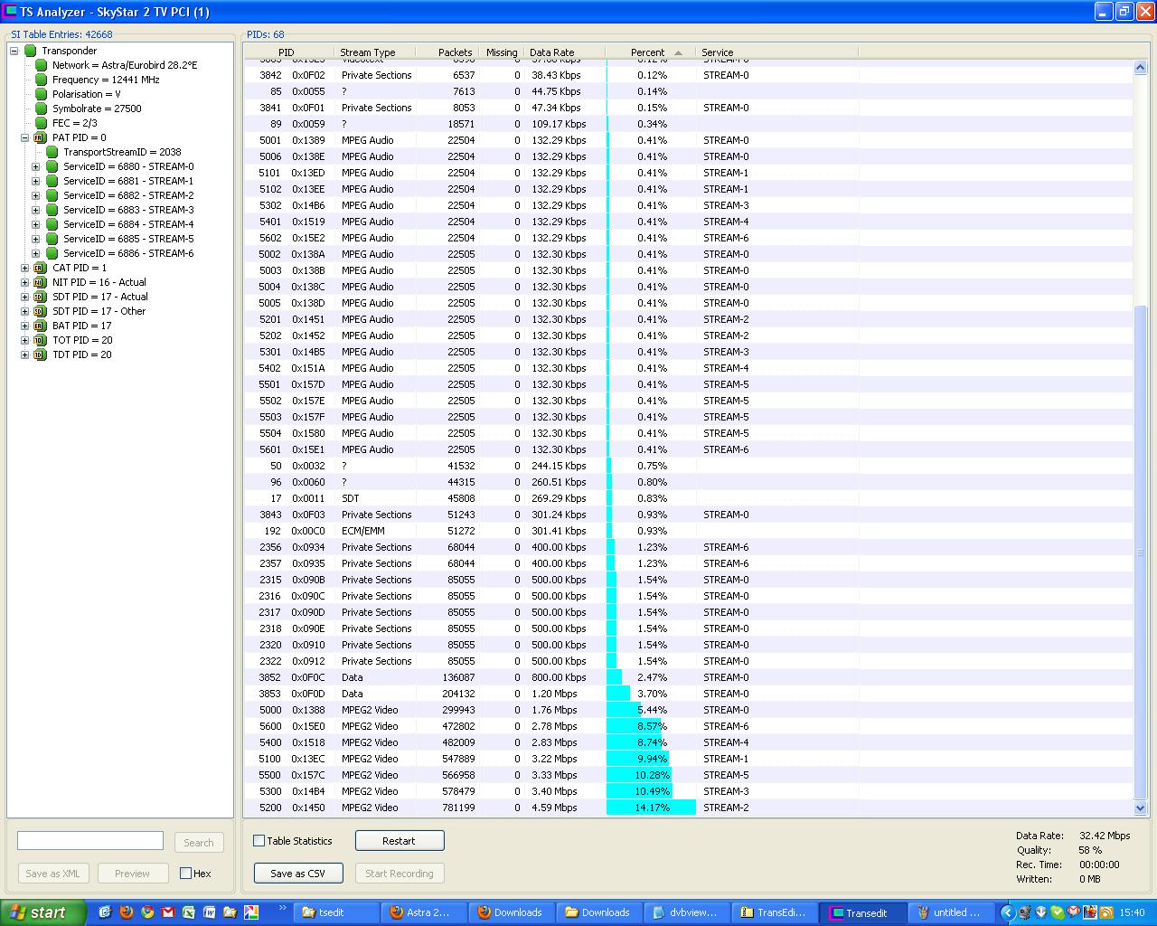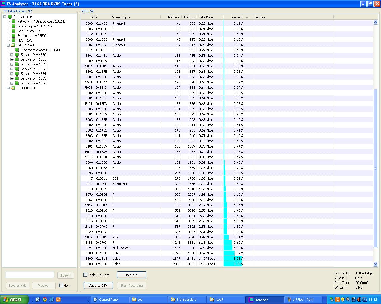 Lakeuk Posted December 13, 2010 Posted December 13, 2010 In my setup I've two cards, SkyStar 2 and a Pinnacle 7010ix, the skystar card works ok but the pinnacle card work pickup channels on certain satellite frequencies. I've ran a transedit against each card on a problem frequency and posted a screenshot of each, it seems that the Pinnacle is picking up streams but not translating the service id's to the channel names like my SkyStar card does. TransEdit.ini Quote