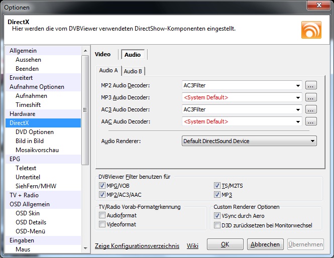 BMWfan Posted January 2, 2011 Posted January 2, 2011 Hey PF-1000, ich habe das Problem nach langem recherchieren gelöst es liegt am AC3Filter lade dir das hier runter --> http://ac3filter.googlecode.com/files/ac3filter_1_63b.exe installier es. Bitte überprüfe bevor du einen Sender anklickst ob im DVBViewer 4.5 unter Einstellungen/DirectX/Audio bei MP2 Audio Decoder und AC3_Audio Decoder AC3 Filter in der Dropdown Liste ausgewählt sind, falls nicht dann dies bitte tun. Gruß Dany Quote