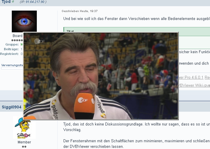 Siggi0904 Posted January 22, 2011 Author Posted January 22, 2011 Tjod, das ist doch keine Diskussionsgrundlage. Ich wollte nur sagen, dass es so ist und nicht den DVBViewer diskriminieren. Ich meinte es nur als konstruktiven Vorschlag. Der Fensterrahmen mit den Schaltflächen zum minimieren, maximieren und schließen ist doch immer da. Zumindest, wenn im Fenstermodus. Darüber sollte sich nur der DVBViewer verschieben lassen. Ich finde es schlecht, gleich für einen solchen Vorschlag diskriminiert zu werden. Danke. Quote