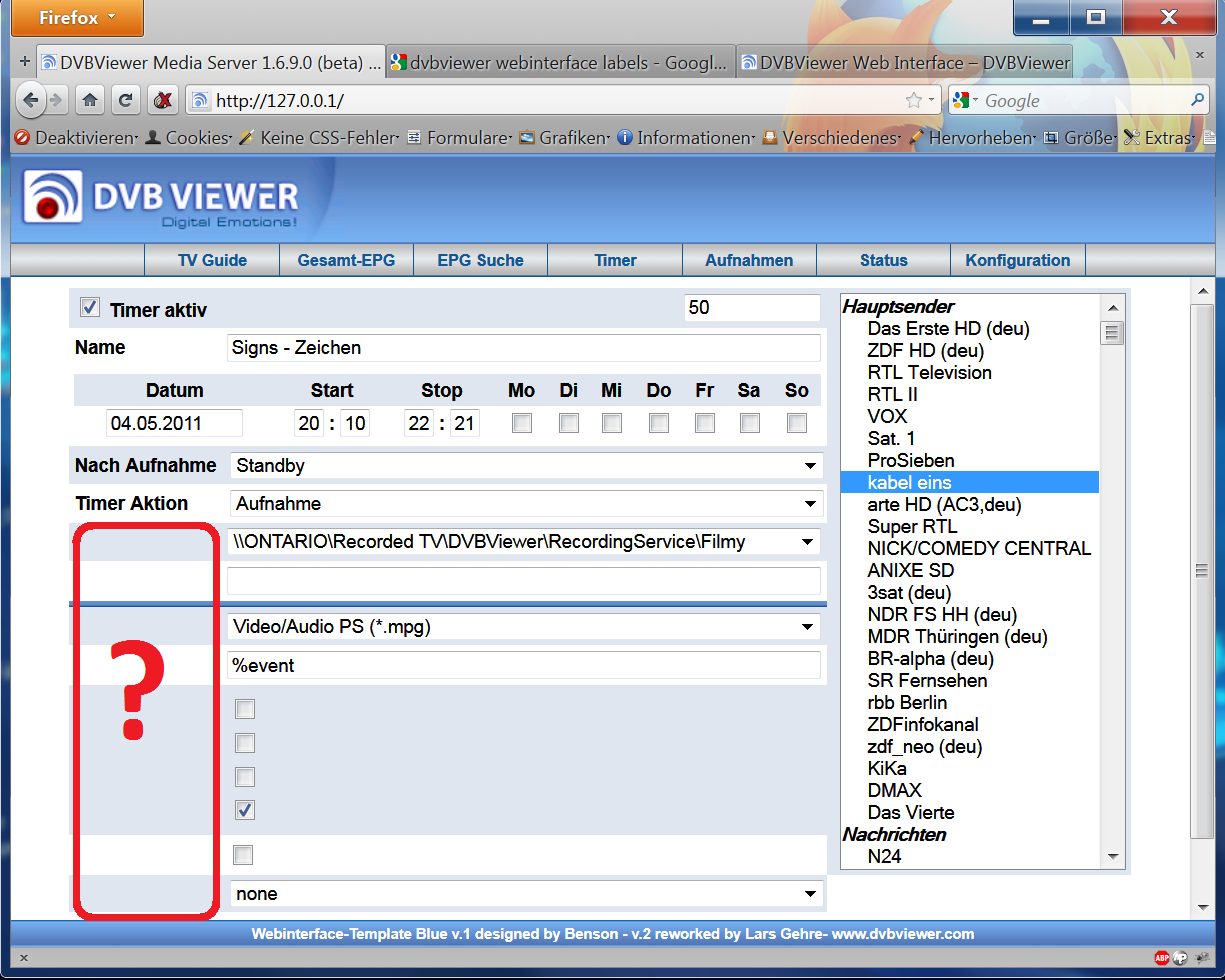 Tjod Posted May 3, 2011 Posted May 3, 2011 Eventuell hat sich da was an der Sprachdatei geändert. Probiere es mal mit dem aktuellen Recording Service 1.7.2 http://www.DVBViewer.tv/forum/topic/19628-recordingservice-beta/page__st__40 Quote