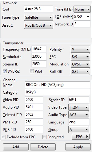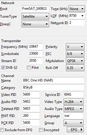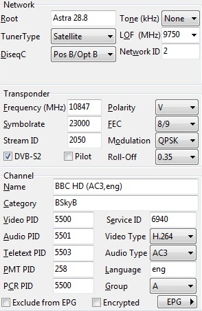 QBox User Posted August 17, 2011 Posted August 17, 2011 Use TransEdit and edit the transponder. Select Satellite Astra 2/Eurobird 28.2E and transponder 10847V. Check "DVB-S2", change symbol rate to 23000 and FEC to 8/9. Click "Apply" and "Scan Selected". Select and update channels. Save 0282.ini on exit. Alternatively, you can use Channel Edit to make the same changes to each channel, but that won't update the 0282.ini file. Quote