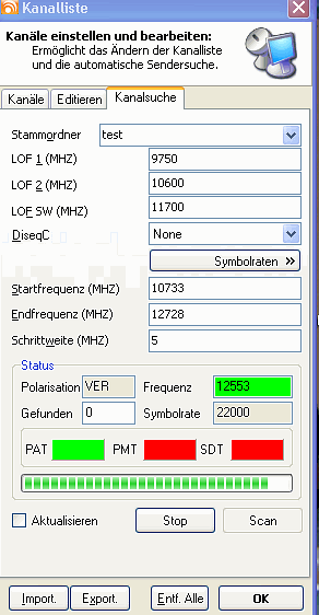 svoscom Posted August 21, 2004 Author Posted August 21, 2004 Über die Anlage empfange ich nur Astra 19,2°E Sender und der TV-Receiver hat nur die DiseqC-Einstellungen A,B,C oder D, wobei die Einstellung auf A steht. A entspricht wohl Pos A/Opt A im DVBViewer. Bei nur einer Satellitenposition dürfte DiseqC aber ohnehin keine Rolle spielen. Die SkyStar2 hat so ihre Probleme mit manchen Multischaltern. Dies äußert sich darin, dass nur ein Teil der Sender ankommt, also nur die aus dem Lowband, oder nur die mit vertikaler Polarisation. Aber dass ein Sendersuchlauf überhaupt nichts findet, ist ungewöhnlich. Die SkyStar2 erhält oder verarbeitet offenbar überhaupt kein Signal. Wenn ein Digitalreceiver an dem gleichen Antennenkabel einwandfrei arbeitet, ist nicht auszuschließen, dass die SkyStar2 defekt ist. Ich würde aber den Stecker bzw. Anschluß noch mal sorgfältig überprüfen. Guckt der Mittelleiter weit genug heraus? Ist sicher, dass sich Mittelleiter und Abschirmung nicht berühren können? Weiterhin solltest du das Unterdrücken von Fehlermeldungen im DVBViewer ausschalten, da diese natürlich auch Aufschluss über die mögliche Ursache geben. Hallo, habe die Unterdrückung der Fehlermeldungen abgeschaltet, aber nach Neustart des Progs keine Errormeldung. Also keine möglichen Anhaltspunkte. Kabel, samt Stecker ist o.k. Habe die Karte in einen anderen Slot gesteckt -> keine Erfolg, Karte in einen anderen PC gesteckt -> kein Erfolg. Ist der Kanalsuchlauf, siehe Anhang o.k.? Was bedeutet es, wenn PAT kurzfristig grün wird ? Habt ihr noch eine Idee ? Danke Sven Quote