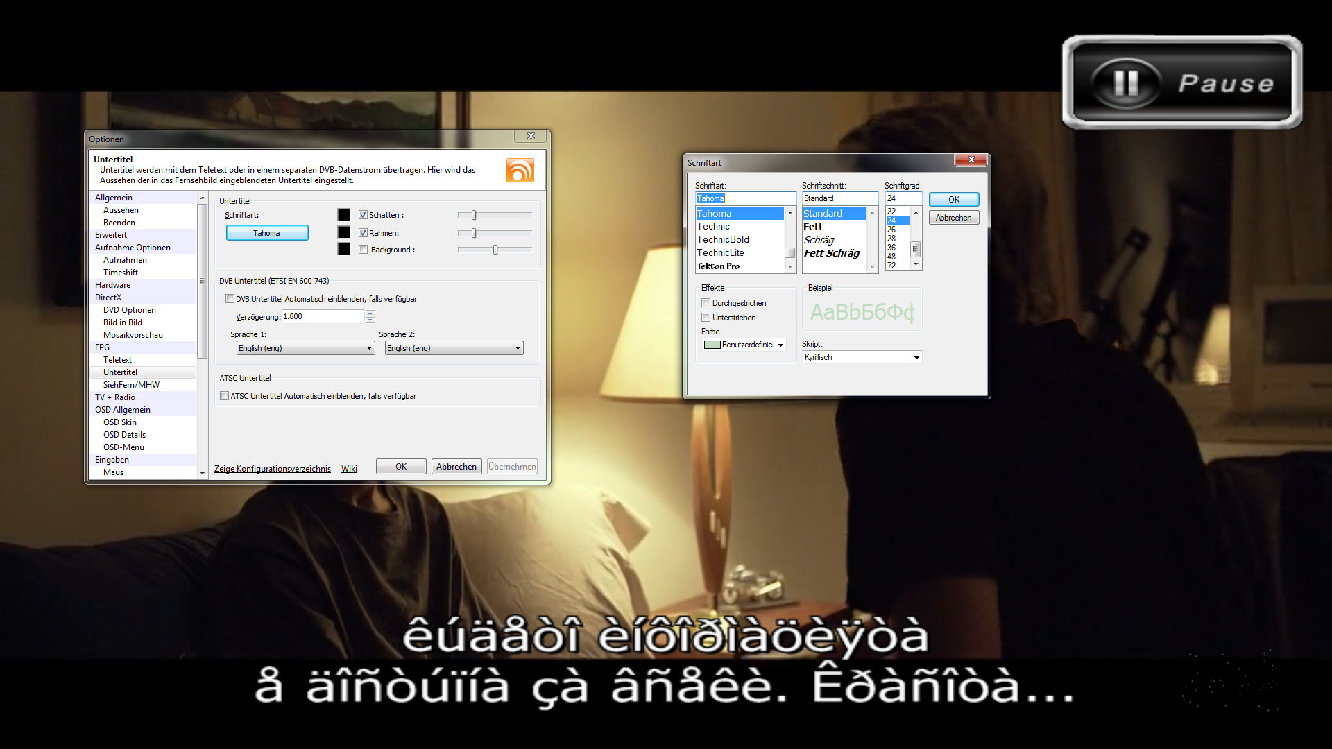 c0cllc Posted July 21, 2011 Posted July 21, 2011 Hallo, auf dem Bild sieht man es am Besten: Schriftart und Skript wurden korrekt eingestellt, trotzdem erscheinen die Untertitel im falschen Zeichensatz. Ich habe auch schon versucht, Sprache 1 und Sprache 2 umzustellen, hat aber auch Nichts gebracht. DirectVobSub funktioniert bei mir in Verbindung mit mkv/mp4+DVBViewer nicht, deswegen der Weg über die internen DVBViewer Einstellungen. Normale AVIs werden (dann mit DirectVobSub)übrigens perfekt mit kyrilischen Untertiteln angezeigt... Hoffe, jemand weiss Rat. Danke vorab Quote
