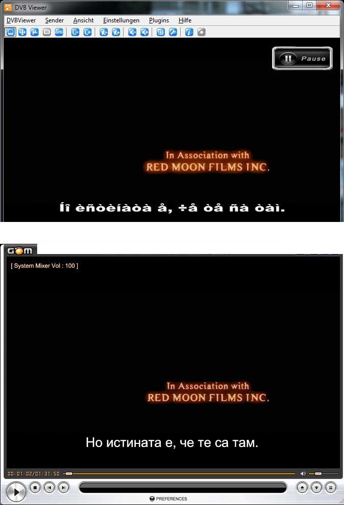 c0cllc Posted September 12, 2011 Author Posted September 12, 2011 (edited) Hallo, da ich keine Antwort bekomme, versuche ich es nochmal. Anbei ein Screenshot-Vergleich der Untertiteldarstellung einer MKV-Datei mit dazugehöriger SRT-Datei durch DVBViewer und durch den GOM-Player. Beide Player wurden intern auf kyrillisches coding umgestellt. Beim DVBViewer musste "Stream 0" aktiviert werden, damit überhaupt etwas dargestellt wird. Ich kann natürlich auch dem GOM-Player nutzen, aber die Idee dieses Forums ist es doch auch, Hilfe bei der Entwicklung zu bieten und dadurch auch Hilfe zu erfahren. Edited September 12, 2011 by c0cllc Quote