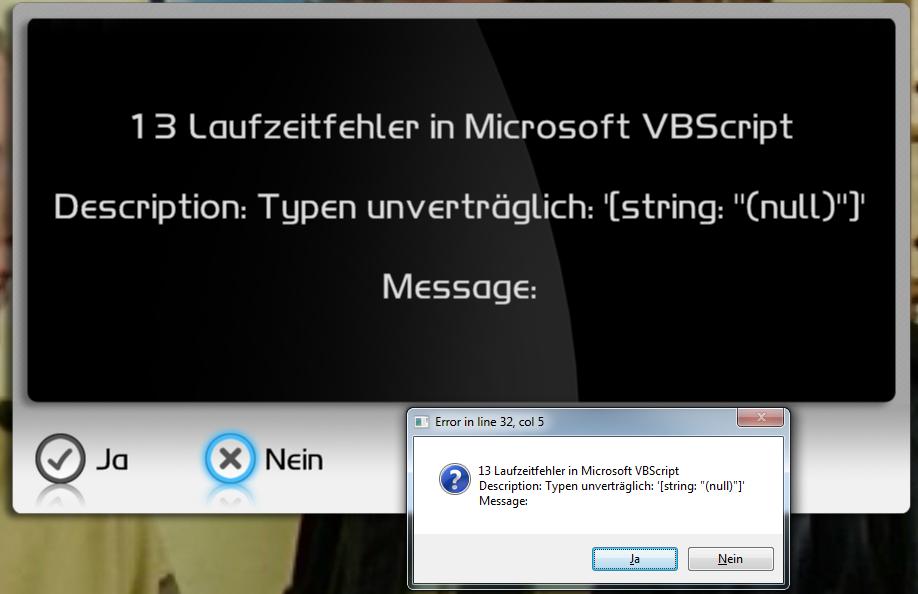 Stinkbärchen Posted August 2, 2011 Posted August 2, 2011 Hallo, nach viel rumbasteln und expermentieren läuft DVBViewer endlich ohne Ruckeln. Als schuldigen habe ich meinen AV-Receiver über Spdif ausgemacht und mir jetzt einen neuen gekauft. Jetzt möchte ich alles Final einstellen und habe ein Problem mit der grünen Taste auf meinem ImonPad RM200. Diese ist nach diesem Thread http://www.DVBViewer.tv/forum/topic/30235-imonpad-mce-konfigdateien/ eingestellt. Ausserdem benutze ich das Neutrinocl Plugin auch aus diesem Forum. Irgendwo ist dort der Wurm drinne. Sobald ich die grüne Taste drücke kommt die Fehlermeldung 13 Laufzeitfehler in Microsoft VBScript - Description: Typen unverträglich: (string: null) - Error in Line 32, col 5 siehe auch Bild in der Anlage. Ich vermute mal, dass ein Eintrag in der Command.vbs (in der Anlage) nicht passt. Es wäre sehr nett, wenn ihr mir weiterhelfen könntet, da ich mich damit Null auskenne. THX command.zip support.zip Quote