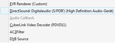 Herr Rossi Posted August 2, 2011 Author Posted August 2, 2011 Yupp wird angezeigt VMR 9 Renderer (Custom) Direct sound: Digital Audio ffdshow raw video filter Cyberlink Vider Decoder (PDVD11) AC3 Filter DVB Source Herr Rossi Quote