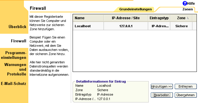 Griga Posted September 4, 2004 Posted September 4, 2004 Also ZoneAlarm unterscheidet zwischen einer Internet- und einer sicheren Zone. Man kann bestimmte IP-Adressen, Hosts/Sites oder Subnetze der sicheren Zone zuweisen und dafür Zugriffe separat erlauben. Alles, was man dort nicht einträgt, wird automatisch der Internet-Zone zugerechnet. Ich habe dort z.B. Localhost 127.0.0.1 eingetragen, wegen dem Virenscanner (die müssen ja neuerdings mit dem M$-Sicherheitscenter kommunizieren können). Aber wie ich das für den DVBViewer/WinLIRC konfigurieren müsste, könnte ich auch nicht auf Anhieb sagen. Lars? Quote