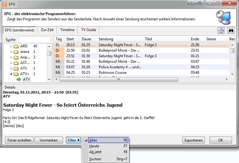 Portisch Posted November 1, 2011 Posted November 1, 2011 nein, Vielen Dank: "Filter" wars. Gewusst - wo. habe alle Einstellungen/Optionen/EPG geprüft, aber natürlich nichts gefunden. Das interessiert mich auch! Ich habe auch nur einen Tag bei der Senderliste (über F7). Bei Filter steht bei mir "Alles": Bei 3 PCs ist es das gleiche... Quote