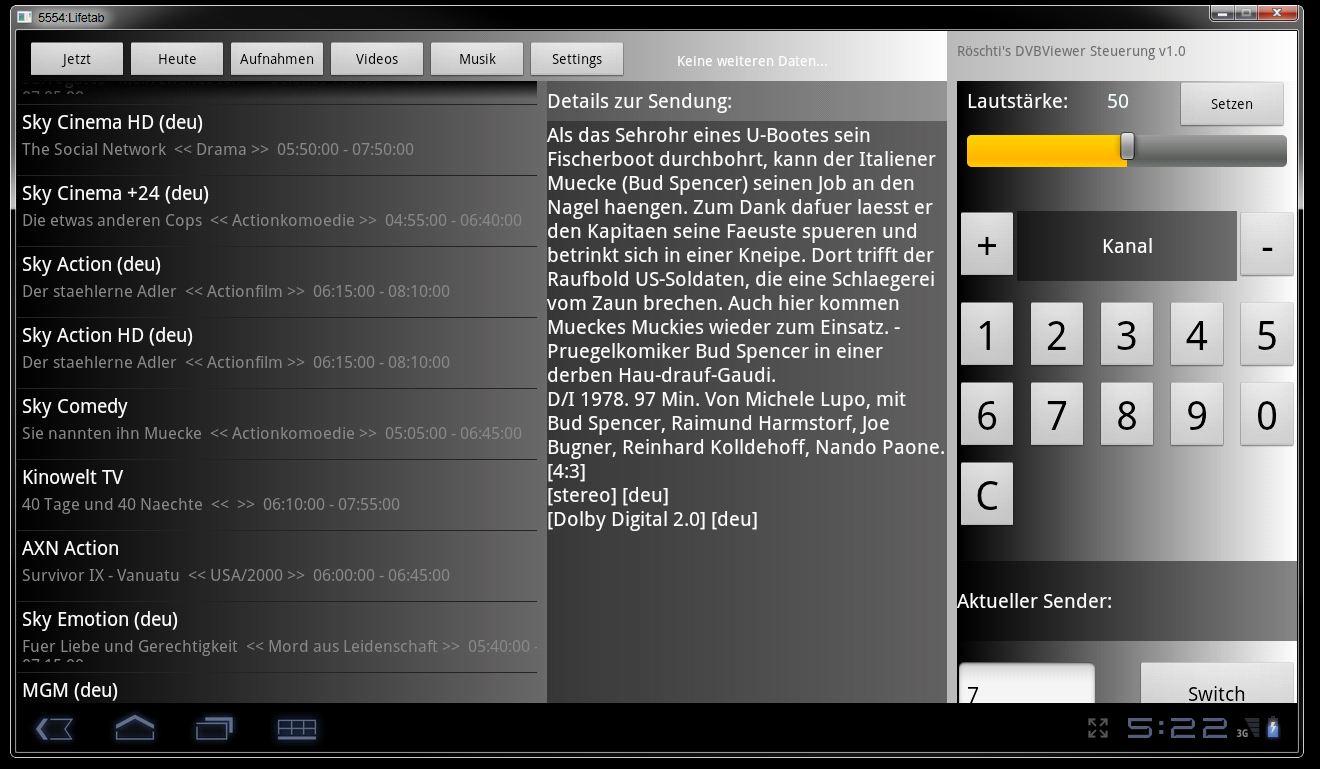 Röschti Posted December 17, 2011 Author Posted December 17, 2011 Yeah, it's growing more and more! Now live streaming works like a charm (see screenshot; btw sorry for the bad quality, it's made with a smartphone cam) It does automatic change the control resolution so the movie aspect ratio keeps original. There's new also a wake up function, via settings u can set how many minutes before a move/show starts u will get waked up by the app :-) It also switches automatic to the choosen channel. I often lay on my couch and see there's an interesting movie in the epg, but it starts in 40min...late at evening I often sleep in on the couch and miss the start of the movie. This happens no longer lol I also changed the screen design to tab controls, 'cause it's easier to manage the different content. The mean thing is: I need both, the recording service and the DVBViewer too on the same machine up and running :-/ maybe i can change this in future. More coming soon... Quote