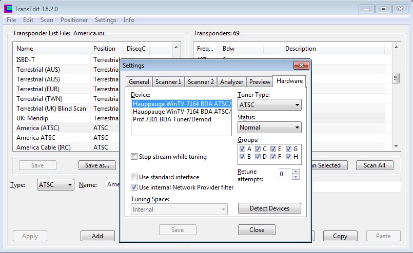 esai Posted December 17, 2011 Author Posted December 17, 2011 There are two Hauppauge entries in the hardware list. A dual tuner card, I guess. What about the second tuner? Set the first one to "Don't use" if you want to try. Please also try the "Use standard interface" option, and attach the file TransEdit.ini here (located in the configuration folder, see Info Menu in TransEdit). It will tell me more than screenshots. Yes is a dual tuner i set one as normal and the other don't use and dosen't work i got the same, if i choice use standard interface then i got the error "Initializing the dvb device has failed" when i used xp i set "standard interface" and tuning space: atsc but it won't work here, i attach the ini file hope that helps! =) TransEdit.ini Quote