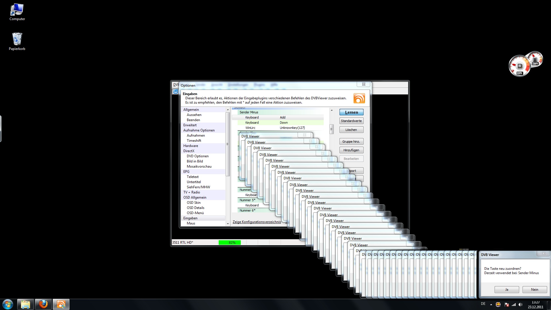 Leska Posted December 22, 2011 Posted December 22, 2011 Guten Abend! Nach geschätzen 1000 Stunden Verzweifelung wende ich mich hilfebedürftig an euch. Ich versuche meine Fernbedienung, die beim im Topic genannten Gerät dabei war, für den DVBViewer zu konfigurieren. Ich habe das Forum durchsucht und habe ALLE Möglichkeiten die ich gefunden habe ausprobiert. Nichts funktioniert. Einzig WTVIRBridge macht mir Hoffnung. Ich habe das Programm nach Anweisung installiert, will ich aber die Fernbedienung anlernen erscheinen fortlaufend Millionen Fenster, ob ich die Tasten ändern möchte, oder so ähnlich. Es gibt ne Auswahlmöglichkeit JA oder NEIN. Kann ich aber nicht auswählen, da wie gesagt fortlaufend unendlich viele Fenster öffnen und das auch nicht aufhört. Die FB scheint er aber zu erkennen, da ich im Hintergrund sehe, das sich die Belegung zu gunsten der FB ändert. Bringt ja aber nichts, da ich nur noch durch Prozess beenden das ganze unterbinden kann. Schließe ich WTVIRBridge und deaktiviere das Plugin, passiert logischerweise gar nichts. Im WTVIRBridge steht ausserdem: Broadcasting key. Shortcut does not exist Looking for shortcut ModernWinTVPVRRemote-Unknownkey(127) Key: Modern WINTV PVR Remote - Unknown key (127) Ich bin am Ende....ich weiß nicht was ich noch alles versuchen soll. Ich hoffe das mir jemand weiterhelfen kann! Grüße Quote